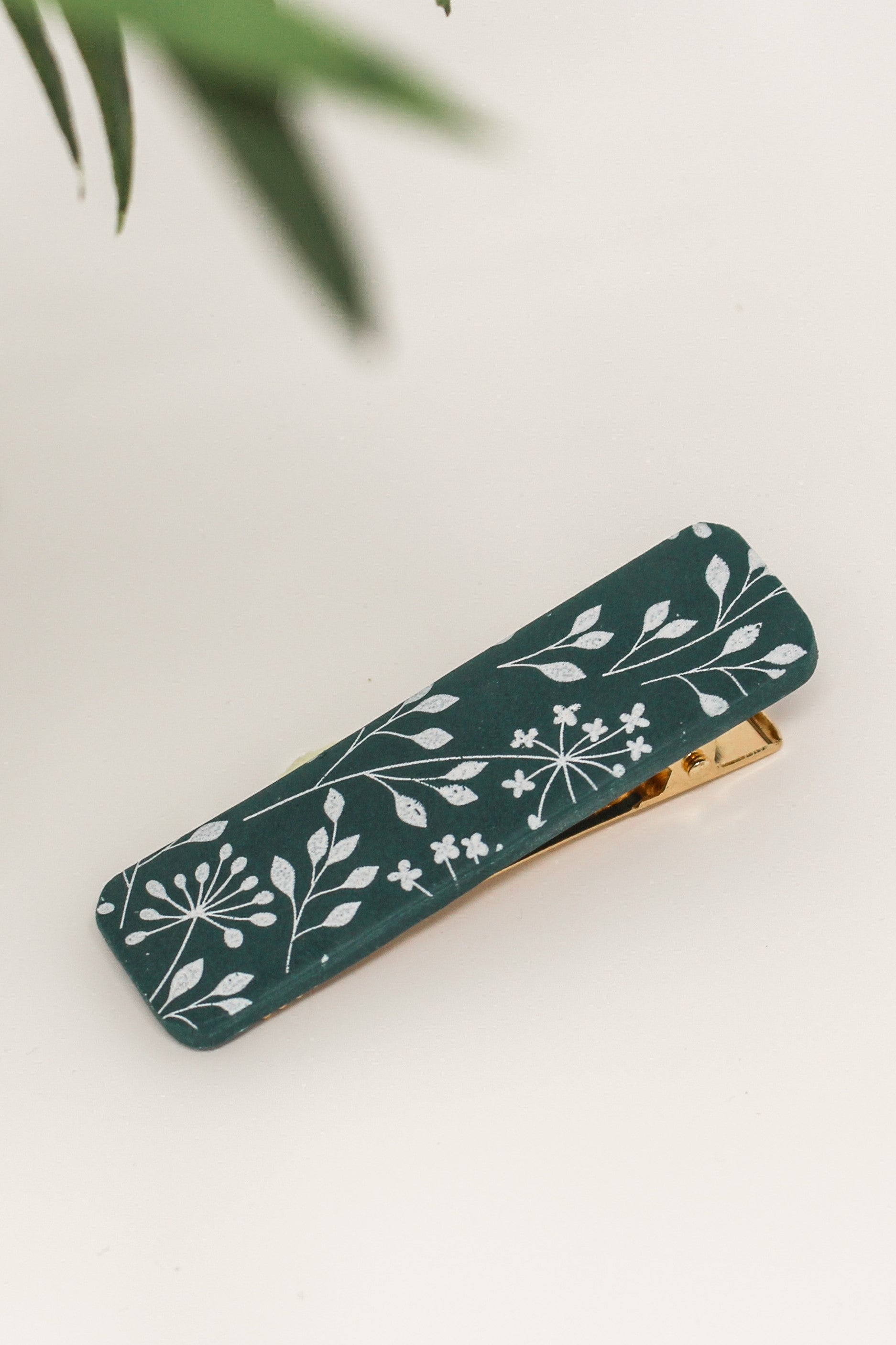 A best selling hair clip since release these in Spring 2022. This dark jade is the perfect contrast with the white botanical design.