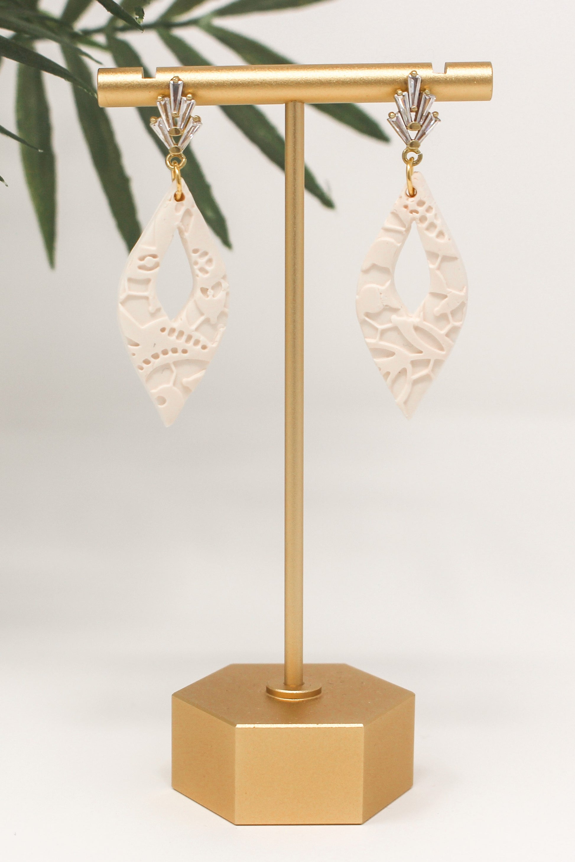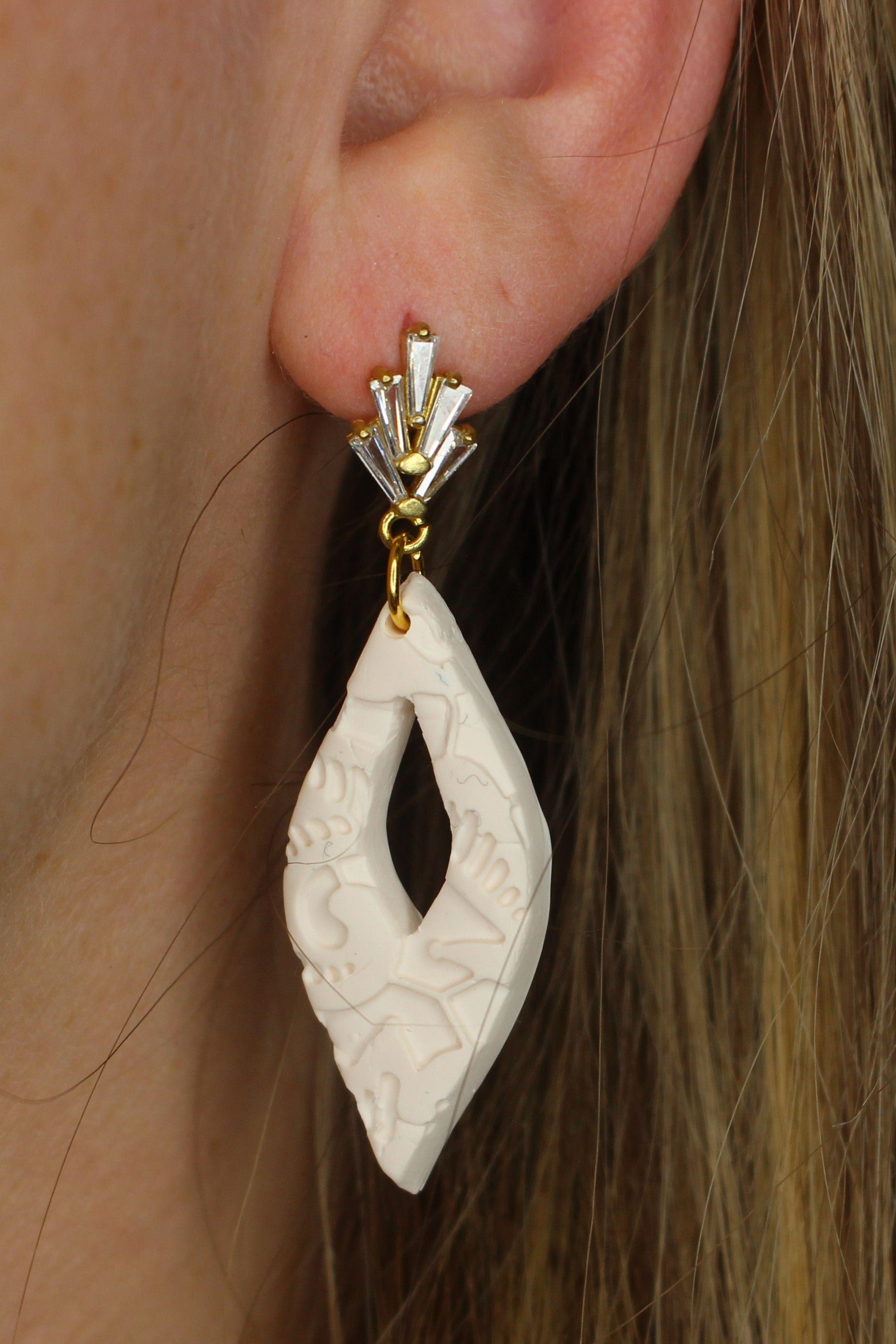 The epitome of elegance. The Swarovski crystal posts enchants you with its gleam and is paired perfectly with the elegant white lace clay.